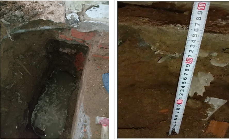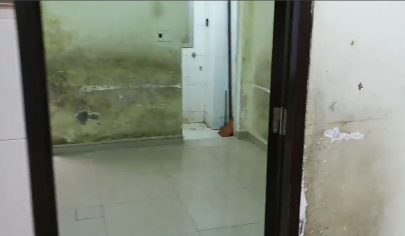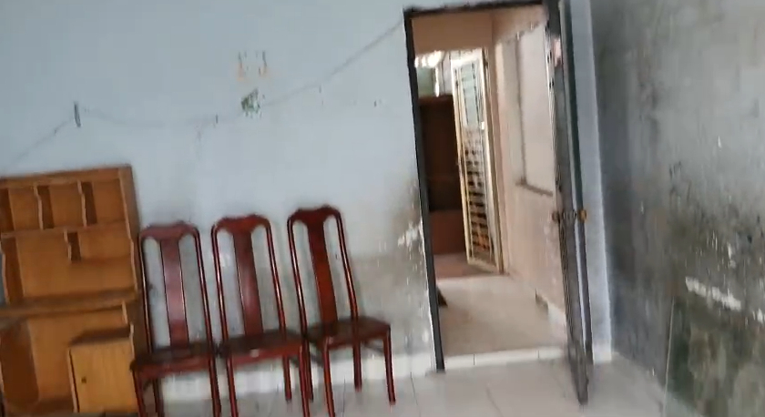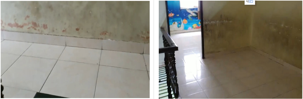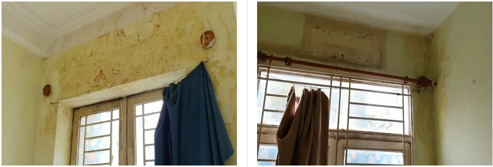 - Bông tróc bề mặt chân tường Nước sơn bị xuống cấp - Nứt tường: Số lượng vết nứt: 03, tổng chiều dài các vết nứt >2m. - Thấm tường nặng, vết thấm xẩm màu và xuất hiện rêu bám. - Thấm trần |