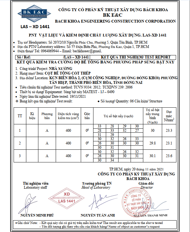 Căn cứ vào kết quả kiểm định tại hiện trường và kết quả tính toán kiểm tra khả năng chịu lực của công trình, Công Ty Cổ Phần Kỹ Thuật Xây Dựng Bách Khoa đưa ra nhận xét và kiến nghị.