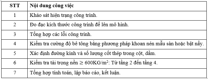 Chủ đầu tư muốn kiểm định lại chất lượng công trình để cải tạo cho mục đích sử dụng khác với thiết kế ban đầu, với tải trọng sử dụng sau khi cải tạo là 600Kg/m2. Chính vì vậy, để đảm bảo quá trình cải tạo và vận hành sử dụng sau này được đảm bảo an toàn thì rất cần thiết được kiểm tra độc lập bởi đơn vị khảo sát, đánh giá hiện trạng có năng lực và uy tín nhằm giúp chủ đầu tư và các đơn vị liên quan có thông tin để đưa ra phương án xử lý phù hợp, đảm bảo chất lượng của công trình trong quá trình vận hành sử dụng.
