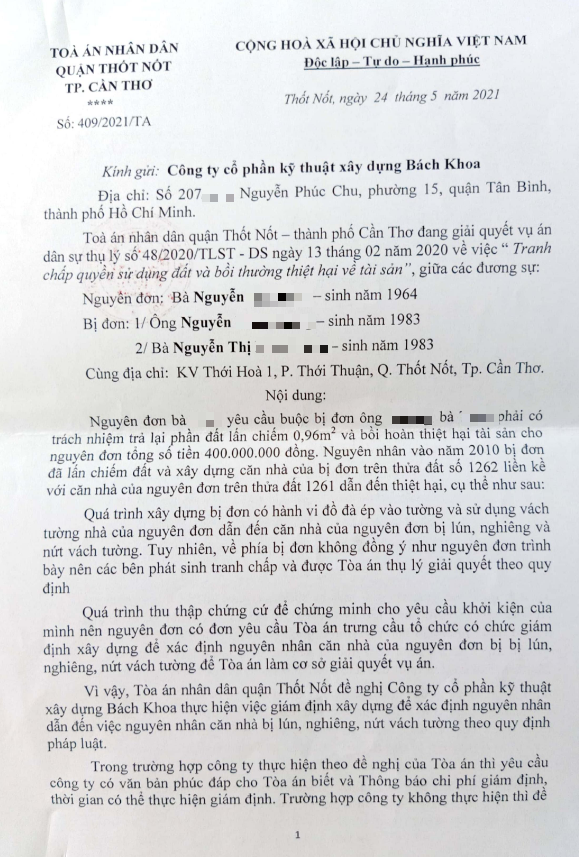 1. Kiểm định tác động của nhà bên cạnh lên công trình của nguyên đơn.