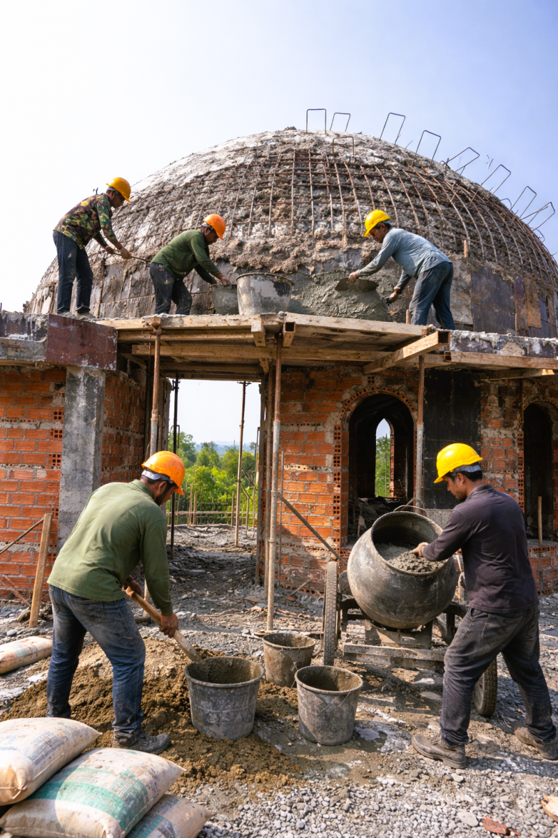- Thi công kết cấu chính: Tiến hành đào móng, đổ bê tông móng, thi công phần thô (cột, dầm, sàn, tường xây) chuẩn kỹ thuật.Thi công hệ thống kỹ thuật: Lắp đặt hệ thống điện, nước, điều hòa không khí, mạng viễn thông và xử lý chống thấm toàn diện.