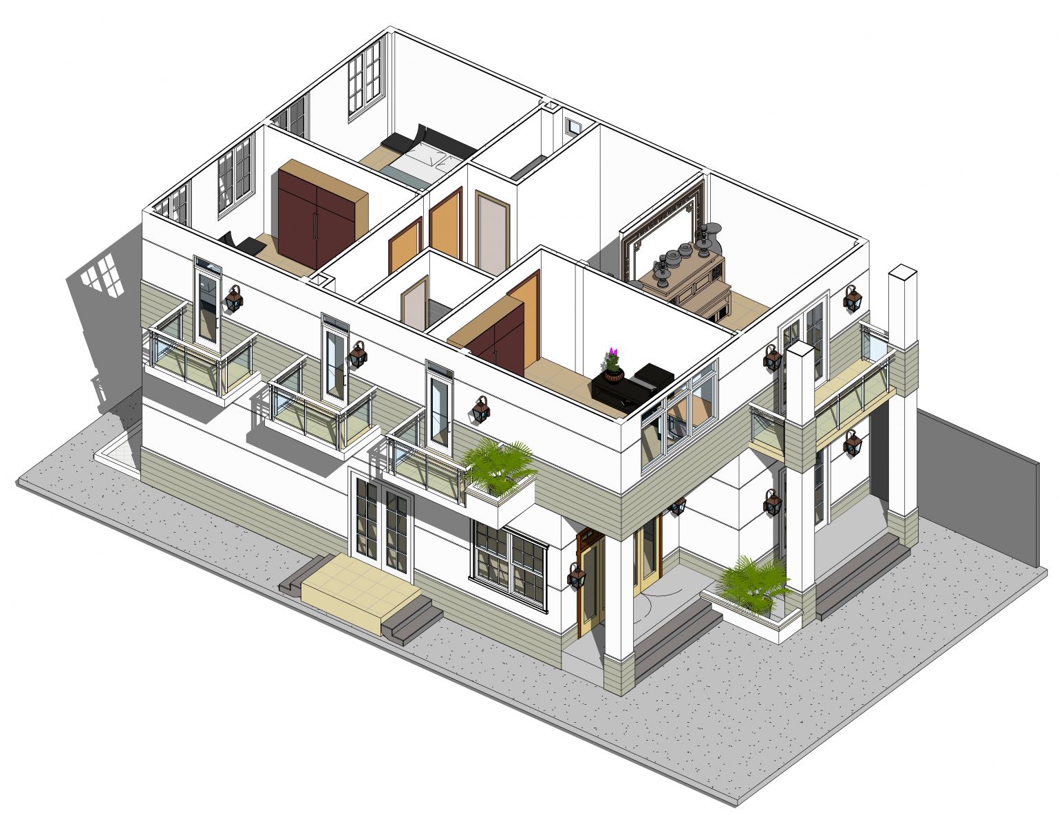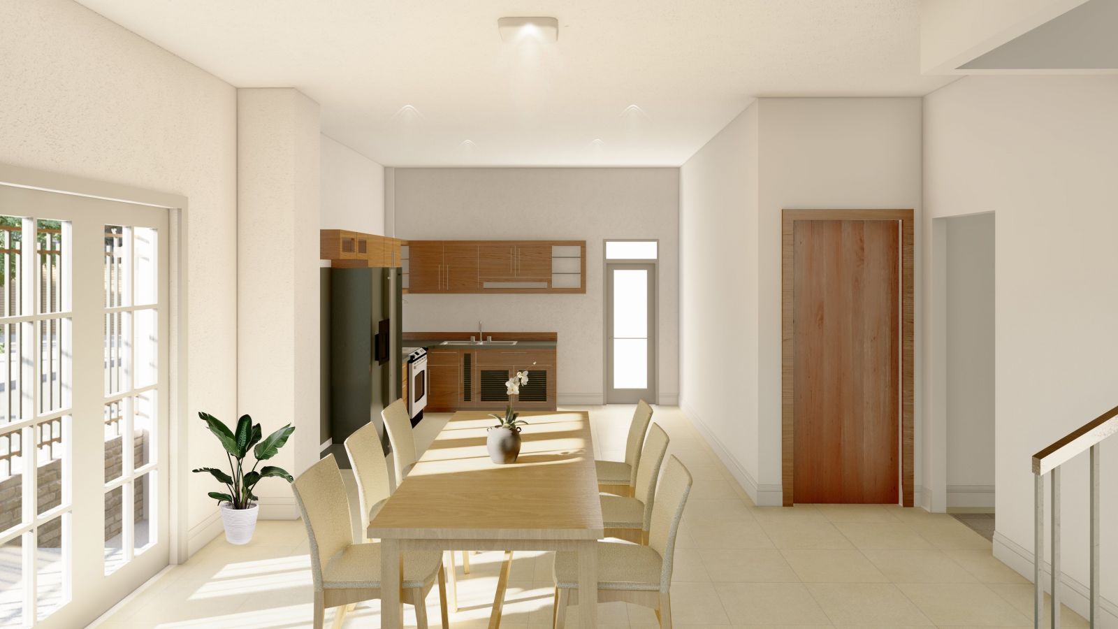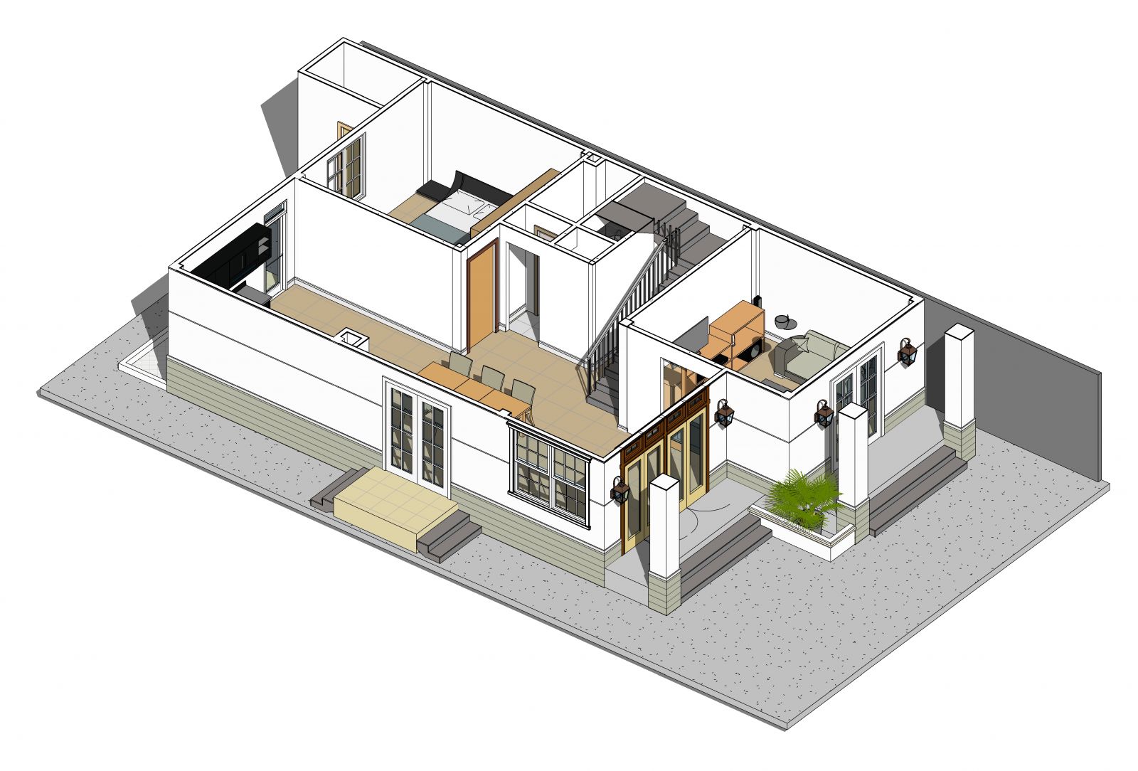 - Tầng trệt: gồm phòng khách, phòng ngủ, phòng bếp + ăn.
